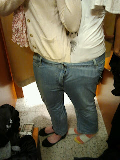 Oltiin muuten tänään siskon kanssa shoppailemassa. Sovitettiin farkkuja, kuten kuvasta näkyy. Ton kokoluokan vaatteet muistuttaa mua hyvin siitä, et toisilla laihduttaminen on vielä paaaaaljon suurempi urakka ku mulla. :) Perjantaina astun vaa'alle ja raportoin tuloksista, mikäli niissä on jotain raportoitavaa....